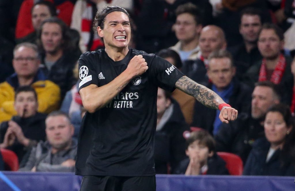 Darwin Nunez of Benfica celebrates his winning goal during the UEFA Champions League Round Of Sixteen Leg Two match between AFC Ajax Amsterdam and SL Benfica Lisbon at the Johan Cruijff Arena (Amsterdam Arena) on March 15, 2022 in Amsterdam, Netherlands. (Photo by John Berry/Getty Images)